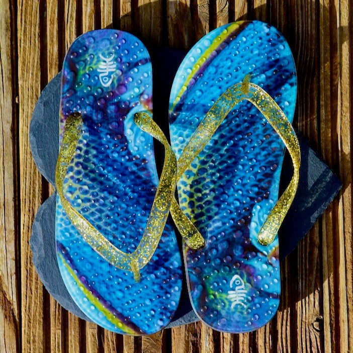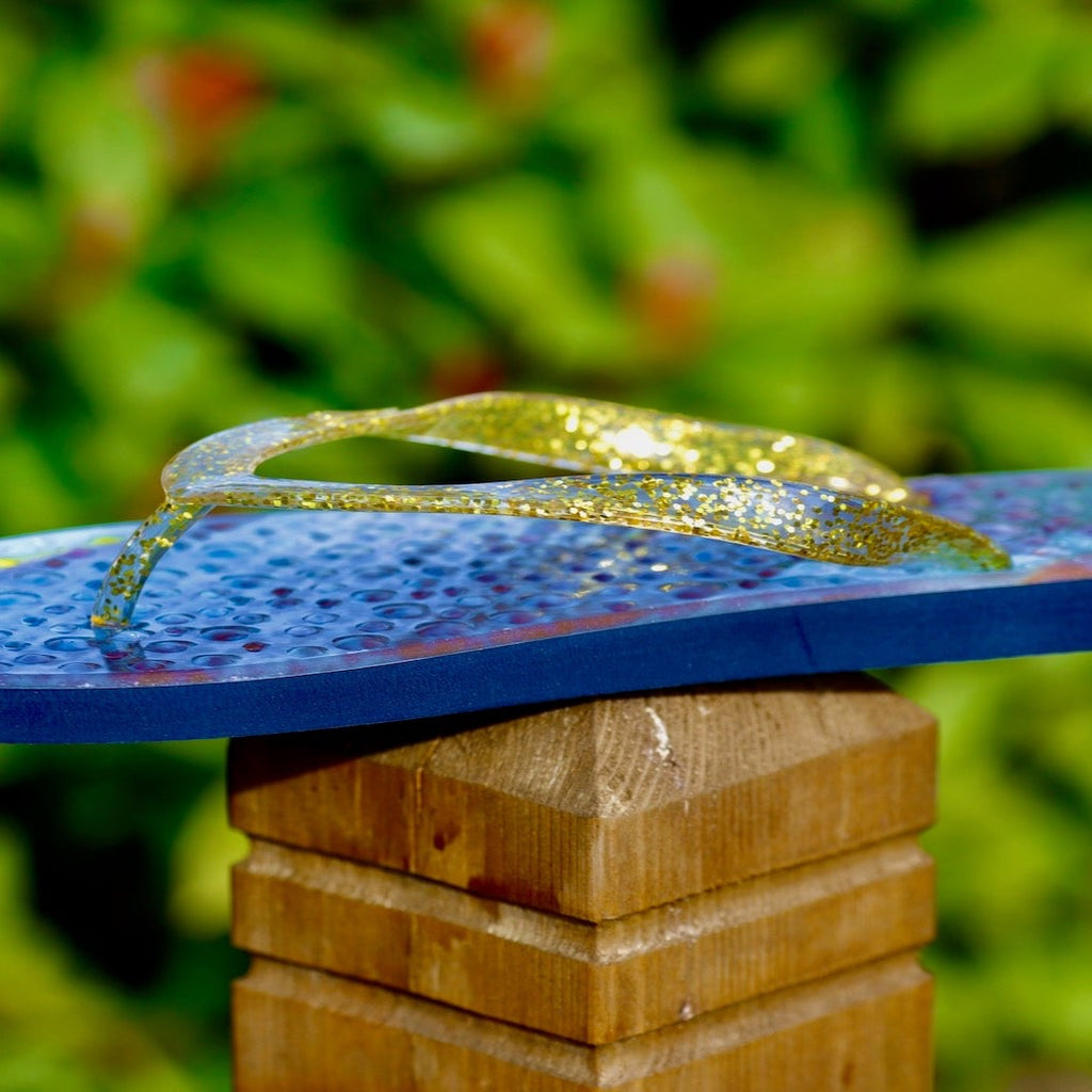 Beautiful Caprice flip flops with gold glitter straps and navy outsole.
