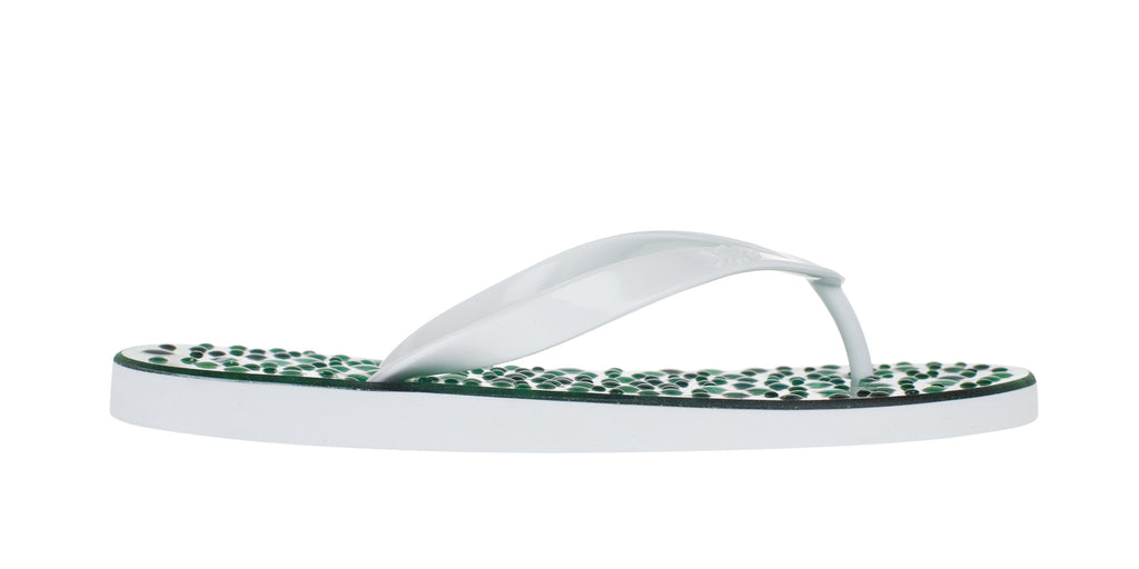 Beautiful Emerald flip flops with white straps and white outsole.